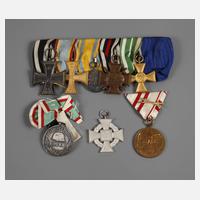vorwiegend 1. Weltkrieg, Eisernes Kreuz 2. Klasse (unleserlicher Hersteller); Verdienstkreuz 2. Klasse Mecklenburg; Friedrich August-Medaille in Silber; Frontkämpferehrenkreuz (R.V. Pforzheim 18); Dienstauszeichnung 1. Klasse Sachsen, 15 Jahre; sowie Abzeichen für Treue Dienste in Silber 3. Reich (Haken an der Spange abgebrochen); dazu separat die Erinnerungsmedaillen Ungarn und Österreich 1914–1918 mit Band, guter Zustand.