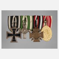 Ordensspange mit vier Auszeichnungen, Eisernes Kreuz 2. Klasse, Hersteller Wilm im Bandring; Albrechtsorden Albrechtkreuz, Modell ab 1910; Frontkämpferehrenkreuz, Hersteller R.V. Pforzheim und Kyffhäusermedaille (mit falschem Band), Hersteller der Spange G. A. Scharffenberg, Goldschmied f.d.K.s. Ordenskanzlei Dresden, guter Zustand.