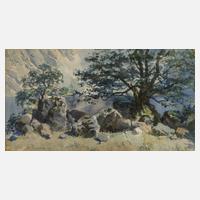 sommerlich-sonnige Seeuferszene am oberhalb des Königssees gelegenen Obersee in den Berchtesgadener Alpen, stimmungsvolle Landschaftsmalerei, Aquarell, um 1900, links betitelt "Am Obersee" und rechts signiert "Wiegk", gering geblichen und lichtrandig, hinter Glas und Passepartout gerahmt, Passepartoutausschnitt ca. 17 x 30 cm. Künstlerinfo: dt. Maler (1872 Coburg? bis 1914 Erlangen), zunächst Ausbildung zum Theatermaler im Atelier für Theatermalerei Lütkemeyer in Coburg, studierte ab 1897 an der Münchner Akademie bei Karl Raupp, schuf eine Serie "Malerischer Ansichten aus Alt-Nürnberg", tätig in Coburg, Quelle: Thieme-Becker, Saur "Bio-Bibliographisches Künstlerlexikon", Matrikel der Münchner Akademie, Grieb "Nürnberger Künstlerlexikon" und Info Ernst Eckerlein im "Coburg-Magazin".