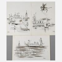 drei Arbeiten, den steigenden Wasserspiegel in Venedig betreffend, teils lavierte Tuschefeder, jeweils signiert und datiert "1972", geringe Altersspuren, Blattmaße ca. 35 x 25 cm. Künstlerinfo: geboren als Alexander Katz, auch Samuel Katz, ungarisch-israelischer Maler, Graphiker, Illustrator und Karikaturist (1926 Wien bis 2010 Naharija), 1938 nach Anschluss Österreichs Flucht der Familie nach Ungarn, fand während der Massendeportationen Unterschlupf in dem unter dem Schutz des schweizerischen Diplomaten stehenden „Glas-Haus“, nach Befreiung Ungarns Architekturstudium an der Technischen Universität Budapest, 1946 Versuch der illegalen Immigration nach Israel, dies misslang und Internierung in Zypern, 1947 Einreise in Israel, 1948 Mitbegründer der Kibbuz Ga´aton (Mateh Ascher), 1950-53 Illustration der Kinderseite einer israelischen Zeitung, 1958 mit dem Schriftsteller Nathan Shaham Afrikareise, es folgten Studienreisen nach dem Iran, Ägypten und Ungarn, 1962 Gerichtszeichner während des Eichmann-Prozesses, tätig für die Zeitungen Maariw, Davar Hashavue und der Schweizer Zeitung Nebelspalter, illustrierte weiterhin über 150 Bücher, Quelle: Wikipedia.