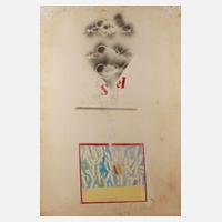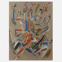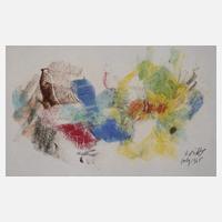 locker angelegte, intensiv farbige Komposition, Fettkreiden, unter der Darstellung in Kugelschreiber rechts signiert und datiert "v. Wicht July 1965" weiterhin in der Darstellung unleserlich betitelt, rückseitig Nachlassstempel, braunfleckig, Blattmaße ca. 27,8 x 21,5 cm. Künstlerinfo: eigentl. Johannes von Wicht, dt.-amerik. Maler und Graphiker (1888 Malente bis 1970 Brooklyn), ab 1907 Beschäftigung mit der Zeichnung, Besuch der privaten Kunstschule des hessischen Großherzogs in Darmstadt, schwere Verwundung im 1. Weltkrieg, 1923 Auswanderung in USA, Quelle: Vollmer und Internet.