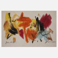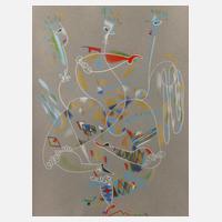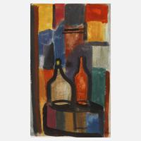 umrissbetontes Arrangement aus zwei Glasflaschen vor buntem Hintergrund, Aquarell und Tusche, rechts unten ligiertes Monogramm und datiert "(19)65", leicht gebräunt, unter einfachem Passepartout montiert, Passepartoutausschnitt ca. 45 x 28,5 cm. Künstlerinfo: dt. Maler und Graphiker (geboren 1903 in Hamburg), Musikstudium in Frankfurt, 1934 Emigration von München nach Jugoslawien, hier intensive Beschäftigung mit der Malerei, während des Nationalsozialismus als entartet eingestuft, 1949 Rückkehr nach Deutschland, Ausstellungen unter anderem in der Galerie von Wolfgang Gurlitt, Quelle: Vollmer.