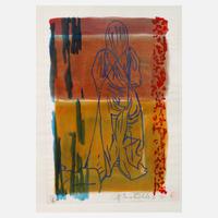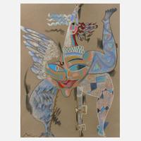abstrahierte Darstellung von drei Damen, farbenfrohe Kreidezeichnung und Goldfarbe auf grauem Papier, unten mittig signiert und datiert "Maiofis (19)94", auf Unterlagekarton montiert, Blattmaße ca. 63 x 48 cm. Künstlerinfo: auch Michel Maiofiss, russ. Maler, Zeichner und Illustrator (geboren 1939 in St. Petersburg), 1989 in die USA ausgewandert, lebt und arbeitet in Los Angeles, Vater des Künstlers Gregori Maiofis, Quelle: Internet.