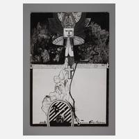 mittig Bischof, umgeben von zahlreichen Figuren und im unteren Bereich collagiertes Portrait, wohl Arbeit zu einem Werk des Dichters, Tusche und Offset auf leichtem Karton, links unten signiert und datiert "Kuhl (19)74" und rechts betitelt "Jean Genet le Balcon", etwas atelierspurig und Retuschen, Maße ca. 68,5 x 49 cm.