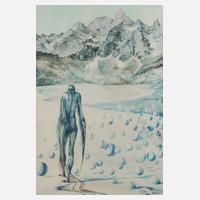 nackte Figur mit Flügeln vor zugefrorenem See mit schwebenden Kugeln und im Hintergrund steil aufsteigendes, teils von Schnee bedecktes Gebirge, Mischtechnik, rechts unten signiert und datiert "AWronsky (19)80", unter Passepartout und hinter Glas gerahmt, Passepartoutausschnitt ca. 64 x 44 cm.