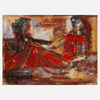 Mann und Frau, sich die Hände reichend, pastose, teils geritzte Malerei, Deckfarben, um 1970, rechts unten unleserlich signiert, hinter Glas gerahmt, Falzmaße ca. 38 x 51 cm.
