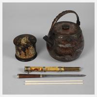 19./20. Jh., drei Teile, bestehend aus Teekanne aus getriebenem Kupfer- bzw. Messingblech in Hammerschlagdekor, teils punziert und silbertauschiert, am Boden ritzsigniert, mit kurzer Schnaupe und klappbarer Handhabe, dazu zylindrische Lackdose mit schabloniertem figürlichen Dekor in Metallic-Optik, sowie Reisebesteck, bestehend aus Messer und zwei Essstäbchen aus Bein, im Bambusetui mit Messingmontierungen, unterschiedliche Maße und Erhaltung, L max. 29,5 cm.