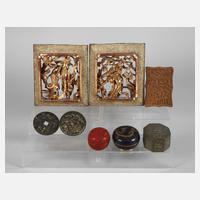 19./20. Jh., insgesamt acht Teile, dabei Paar vergoldete Reliefschnitzereien, rückseitig mit Lacksiegel, dazu drei Deckeldosen aus Lack, Metallguss und Cloisonné, sowie ein geschnitztes Visitenkartenetui, Cashmünze und Handspiegel, unterschiedliche Maße und Erhaltung, L max. 18 cm.