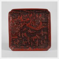 Ende 19. Jh., an der Unterseite gemarkt, aufwendige Lackarbeit in Rot, quadratisches Tablett mit gekniffenen Ecken, der Spiegel komplett figürlich verziert, mit Darstellung des höfischen Lebens in weiter Ideallandschaft, gute Erhaltung mit leichten Altersspuren, Maße 32 x 32 cm.