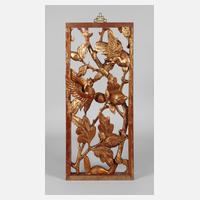 20. Jh., Laubholz beschnitzt, farbig gefasst und goldbronziert, durchbrochen gefertigtes Astwerk, verziert von Vogelmotiven, kleinere Retuschen, trocknungsrissig, Maße 64 x 29 cm.