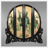 Ende 20. Jh., signiert, Stellschirm aus vier klappbaren Segmenten, Hartholz beschnitzt, schwarz gefasst, kreisrundes Zentralelement mit goldbronziertem Fond, verziert von halbplastischen Einlegearbeiten aus Jade, Speckstein und Onyx, rückseitig florale Lackmalerei, Maße 185 x 200 cm.