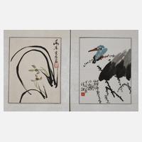 1. Hälfte 20. Jh., signiert und gestempelt, Mischtechnik auf Papier, leicht stilisierte Darstellung eines Vogels in Landschaft sowie eines Floralmotivs, beide in textilem Passepartout gefasst, leichte Erhaltungsmängel, IM je ca. 22 x 17 cm.