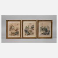 Mitte 20. Jh., alle signiert und gestempelt, Mischtechnik auf Seide, figürliche Landschaftsmalereien in leicht stilisierender Formensprache, hinter Glas in schmalen Leisten gefasst, Maße ges. je ca. 22 x 17 cm.