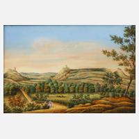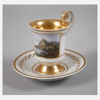 um 1840, ungemarkt, am Boden undeutliche Pinselbezeichnung in Schwarz, Zylinderform mit Goldrändern, schauseitig große Rechteckkartusche mit Vedute in polychromer Aufglasurbemalung, Panoramablick auf eine Gebirgslandschaft mit Uferterrasse, Anglern und Flaneuren, dazu wohl originale Untertasse mit Ritznummer 4, Goldränder etwas berieben, sonst guter altersgemäßer Zustand, H 6,5 cm.