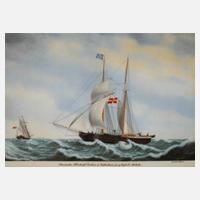 nach einem Gemälde von Jacob Petersen (1774–1855), Porzellanmanufaktur Bing & Gröndahl, goldene Stempelmarke 1983–2004, limitierte Auflage, Exemplar 338/3500, querrechteckige Porzellanplatte mit polychromem Dekor, Darstellung zweier Zweimaster auf bewegter See, unter dem Motiv dänisch bezeichnet, original auf Bildträger montiert und in Goldleiste gerahmt, rückseitiges Erläuterungsblatt berieben, sonst guter Zustand, Maße Platte 21,5 x 30 cm, Maße max. 30 x 38,5 cm.