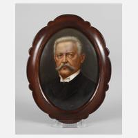 Pressmarke ab 1870, Prägebuchstaben Sz und Jahreszeichen für 1904, ovale, leicht gewölbte Porzellanplatte mit feiner polychromer Bemalung, Brustportrait des deutschen Generalfeldmarschalls und Politikers Paul Hindenburg in Anzug vor dunklem Grund, rechts mittig signiert L. Geyer., in geschweiftem Holzrahmen, auf der Stirn farbig kaschierter Chip, sonst guter altersgemäßer Zustand, Maße Platte max. 17 x 12,6 cm, Maße Rahmen 21,5 x 17 cm.