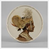unterglasurblaue Zepter- und Kriegsmarke 1914–1918, einmal gestrichen, geprägte Modellnummer 9076 sowie Monats- und Jahreszeichen für 1917, elfenbeinfarbenes Porzellan, flache Form mit geschweift reliefiertem Rand, im Spiegel Schulterstück einer reich geschmückten Afrikanerin im Profil, in feiner polychromer Aufglasurbemalung, Wandaufhängung, guter Zustand, D 31 cm.