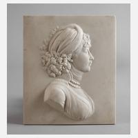 blaue Zeptermarke 1870–1945, geritzte Modellnummer 9732, Prägezeichen und Jahreszeichen für 1909, fast quadratische Biskuitporzellanplatte mit reliefiertem Brustbildnis der preußischen Königin (1776–1810) im Profil, mit Demi-Turban und Perlenkette, bezeichnet "Heinr. Bettkober fecit/d´apre La Natur a Berlin 1798", nach einem Relief von Christian Friedrich Heinrich Sigismund Bettkober (1746–1809), ungerahmt, rechte obere Ecke minimal bestoßen, sonst guter altersgemäßer Zustand, Maße 19 x 16 cm.