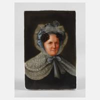 1. Hälfte 19. Jh., ungemarkt und unsigniert, hochrechteckige Porzellanplatte mit feiner polychromer Bemalung, Bruststück einer elegant gekleideten Dame mittleren Alters, mit weißem Spitzenkragen und Spitzenhaube, vor dunklem Grund, sehr guter Zustand, Maße 9,5 x 6,5 cm.