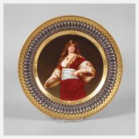 wohl Porzellanmanufaktur Rädler & Pilz, um 1900, unterglasurblaue Bindenschildmarke, goldgepinselte Nummer 190. und 2 sowie Bezeichnung, im Motiv rechts unten signiert G. Macheleidt, leicht gemuldeter Teller mit feiner polychromer Aufglasurbemalung im Spiegel, Hüftbildnis einer jungen Orientalin nach dem Gemälde "Mädchen mit Tamburin" von Friedrich Paul Thumann (1834-1908), die königsblau glasierte Fahne mit üppiger, teils goldgeätzter Ornamentbordüre sowie Emaille- und Reliefgoldmalerei, sehr schöner, minimalst kratzspuriger Zustand, D 24,5 cm.