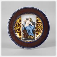 im Alt-Wiener Stil, wohl Böhmen, 2. Hälfte 19. Jh., unterglasurblaue Bienenkorbmarke, gemuldeter Teller mit zwei reliefierten und kobaltblau glasierten Perlfriesbändern, braun staffiertem Fond und polychromer Aufglasurbemalung im Spiegel, in der großen Rechteckreserve Darstellung einer jungen sitzenden Frau als Halbakt, mit reicher Tuchdraperie, zwischen zahlreichen Musikinstrumenten und Spruch "Der Strom der Harmonieen dir erklingen." (aus Friedrich Schillers "Die Huldigung der Künste"), flankiert von je einem Greifenpaar mit Ziervase, Wandaufhängung, Fahne mit Bandfehler und einem rückseitigen Haarriss, D 24,5 cm.