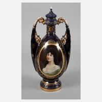 Porzellanmanufaktur Ackermann & Fritze Volkstedt, unterglasurblaue Bienenkorbmarke 1908-1960, Prägenummer 5467, Ritz- und Pinselnummern, ovoide Amphorenvase mit ornamental durchbrochen gearbeitetem Hals und Deckel, königsblauem Fond sowie polychromem und goldenem Umdruckdekor als beidseitige Ovalkartusche mit Brustportrait einer Jugendstilschönheit nach einem Gemälde des Italieners Angelo Asti bzw. Blumenbukett, Streublümchen und reiche Vergoldung, diese partiell etwas berieben, am Mündungsrand ein Chip, H 40 cm.