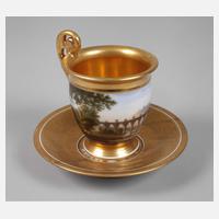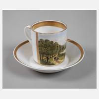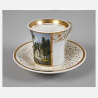 unterglasurblaue Zeptermarke KPM 1837–1844, Ritzzeichen, Becherform, schauseitig große Rechteckkartusche mit Vedute in feiner polychromer Aufglasurbemalung, Parklandschaft mit zentralem Gebäude und Figurenstaffage, am Boden Pinselbezeichnung "Das gothische Häuschen im Fürst. Park zu Ebersdorf." (Thüringen), seitlich des Motivs filigrane Floralbordüre in Goldmalerei sowie Goldränder, dazu nicht ganz passend ergänzte Untertasse der Zeit mit floraler Goldmalerei, unterglasurblaue Strichmarke und grüne Pinselnummer 74, Vergoldung minimal berieben, sonst guter altersgemäßer Zustand, H Tasse 8 cm, D Untertasse 15 cm.