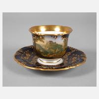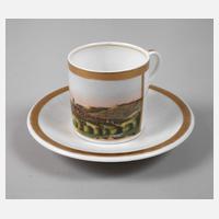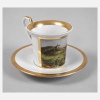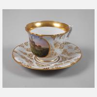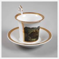 braune Stempelmarken 1834-1860, Prägenummer 25, geschweifte Form mit reliefiertem Rand, Goldstaffage, üppiger floraler Goldmalerei und großer schauseitiger Ovalreserve mit Vedute in feiner polychromer Aufglasurbemalung, Panoramablick auf eine Burg mit angrenzender Stadt im Hintergrund, unter dem Motiv in Gold datiert "Den 8t. Januar 1859.", Innenlippe vergoldet und goldener Spiegelfaden, dazugehörige Untertasse mit gleicher Goldmalerei und Monogramm J.S., guter altersgemäßer Zustand, H gesamt 8 cm.