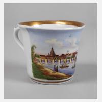 unterglasurblaue Adlermarke 1844–1847, Becherform, schauseitig rechteckige Elbansicht der Dresdner Altstadt mit Segel- und Dampfschiffen sowie Figurenstaffage in polychromer Aufglasurbemalung, Goldränder wohl übergangen, Innenlippe mit kleinem Chip und davon ausgehender vertikaler Haarriss (rechts von der Frauenkirche), H 7 cm.