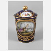 Porzellanmanufaktur Sévres, rote Sondermarke 1845-1848, blaue Pinselmarke der Malereiwerkstatt sowie undeutliche Ritzzeichen, konische Form mit Ohrenhenkel und gewölbtem Stülpdeckel mit Obstknauf, reich verziert mit königsblau glasiertem Fond und üppigen goldradierten Kartuschen, die figürliche Darstellung in der großen schauseitigen Ovalreserve und die Blumenbuketts der beiden Deckelreserven in feiner polychromer Aufglasurbemalung, Goldstaffage und Goldrand, partiell alt restaurierter Zustand, an der Lippe Chip und 2 cm langer Haarriss, H gesamt 14 cm.