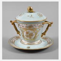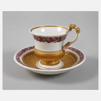 unterglasurblaue Zeptermarken 1870–1945, jeweils ein Unterstrich, Prägebuchstabe U und Jahreszeichen für 1909, gefußte Glockenbecherform mit hoch angesetztem Henkel, klassizistischem und goldbronziertem Reliefdekor an Fuß, Bauch und Henkel, umlaufender Rosenkranz in feiner polychromer Aufglasurbemalung sowie Goldrand, dazugehörige Untertasse mit gleichem Dekor, Rosenblüten partiell reinigungsbedürftig, sonst guter Zustand, H gesamt 10,5 cm.