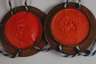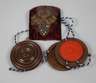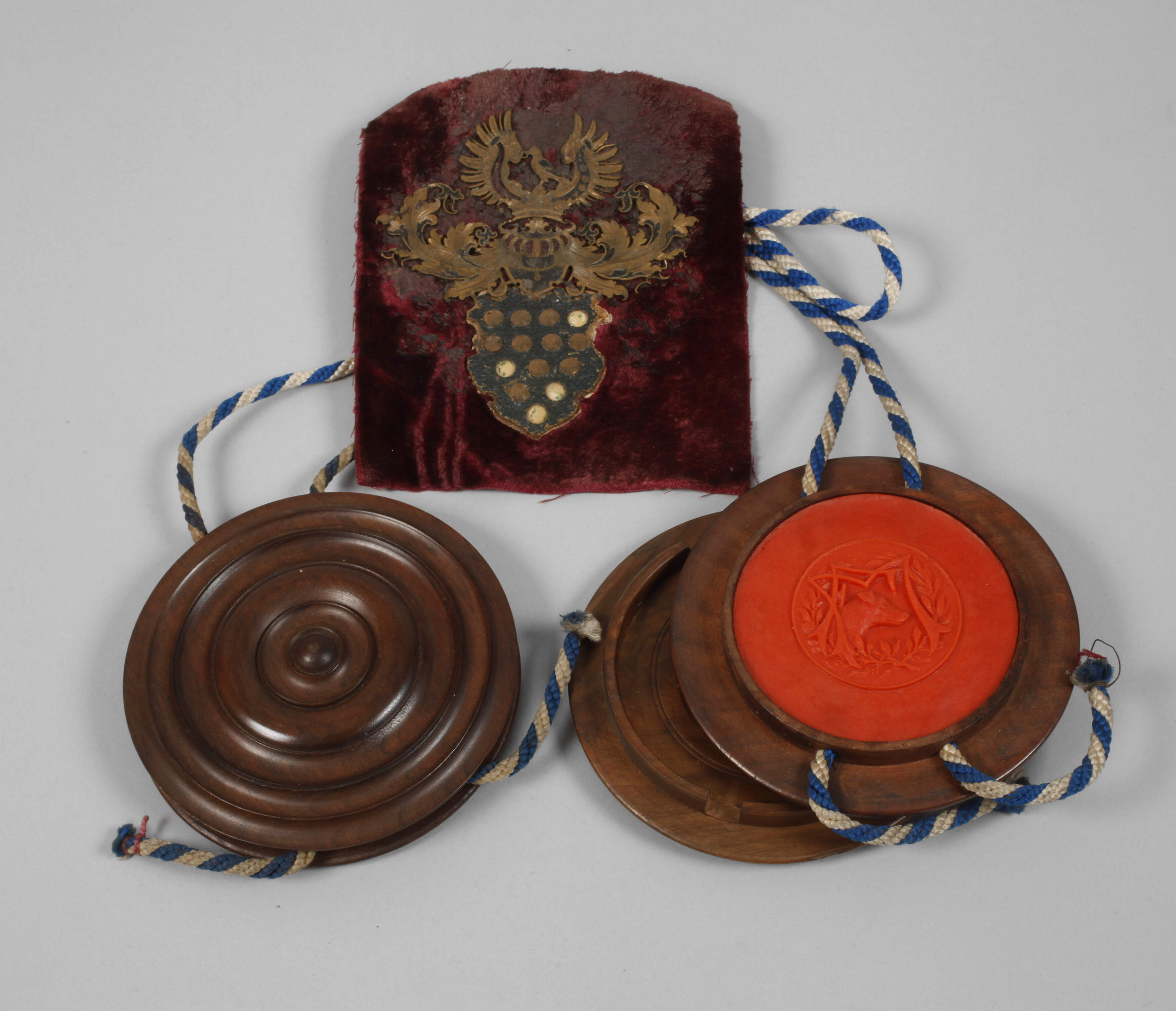 19. Jh., fein ausgesägtes und graviertes Familienwappen der Familie von Bülow, 14 goldene Kugeln auf blauem Grund (gefärbtes Leder), darüber der Helm und ein Pirol, der einen goldenen Ring im Schnabel hält, mehrere Fehlstellen im Wappenschild, den Helmdecken und der Helmzier, auf rot-violetten Samt montiert, H 12 cm, B 10,3 cm, dazu zwei Siegelkapseln, wohl für Leistungen in der Hundezucht, mit Siegelmasse gefüllte Nussbaumkapseln, darauf ein Hundekopf im Lorbeerkranz, darüber die Buchstaben F M als Ligaturmonogramm, durch die Siegelmasse verlaufen zwei weiß-blaue Kordelschnüre, altersgemäßer Zustand, D ca. 11 cm.