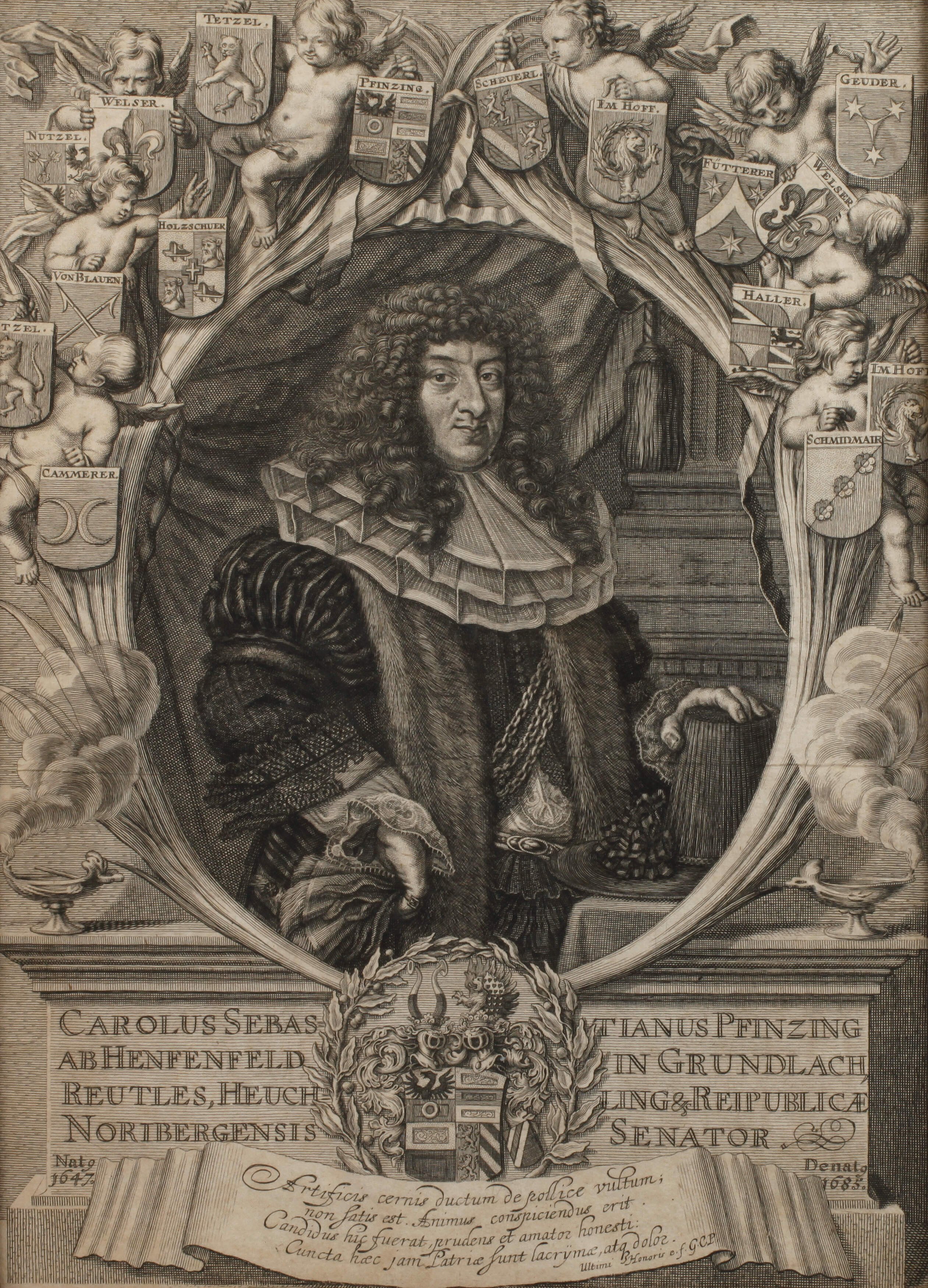 Portrait des Nürnberger Patriziers im Oval, umgeben von zahlreichen Putti und Wappen, im unteren Bereich Text, Kupferstich, um 1700, unter der Darstellung rechts bezeichnet "J. Sandrart Sculpsit" (durch Rahmung verdeckt), leichte Faltlinie, hinter Glas gerahmt, Sichtmaße ca. 39 x 29 cm. Künstlerinfo: dt. Kupferstecher, Kunsthändler und Verleger (1630 Frankfurt am Main bis 1708 Nürnberg), 1635 Übersiedlung nach Hamburg und später nach Haag, 1640 Schüler seines Onkels, des Malers und Kupferstechers Joachim von Sandrart in Amsterdam, anschließend vier Jahre Kupferstecherlehre bei Cornelis I. Danckerts in Amsterdam, 1644–48 Kupferstecherausbildung bei Willem Hondius in Danzig, danach 1 ½-jährige Reise über Thorn, Breslau und Wien nach Regensburg, ab 1656 in Nürnberg ansässig, 1662 Gründung der „Maler-Akademie“ (heute Akademie der Bildenden Künste Nürnberg), zu deren erstem Direktor er zusammen mit Georg Christoph Eimmart dem Jüngeren ernannt wird, Quelle: Thieme-Becker und Wikipedia.