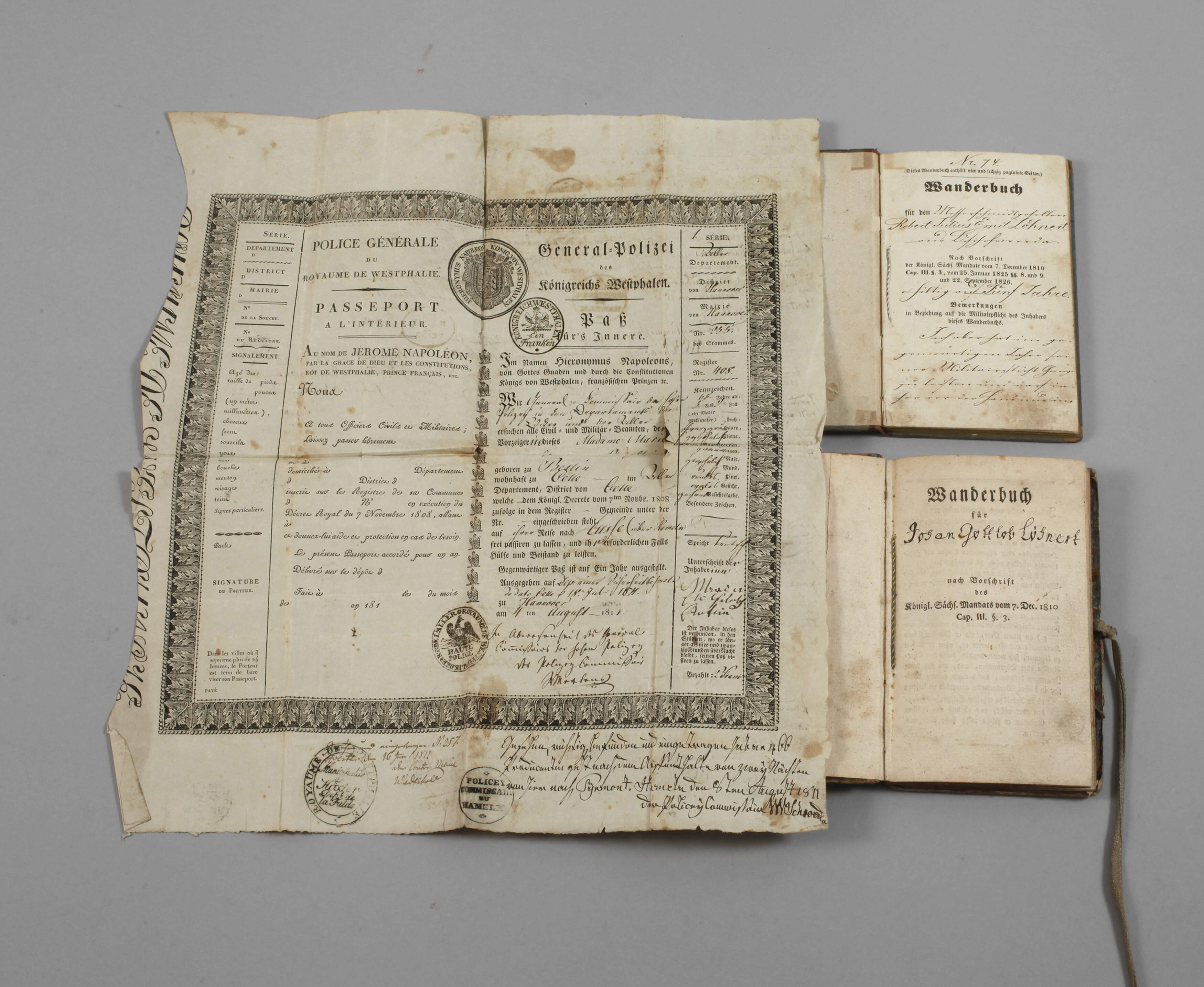 Anfang 19. Jh., zwei gesetzliche Wanderbücher mit vielen Eintragungen, Stempeln, Siegeln, Übertritte nach Österreich..., zum Sammeln von Berufserfahrung und Techniken der jeweiligen Zunft, Maße ca. 11 x 17 cm, sowie ein Reisepass des Königreichs Westphalen, datiert 1818, ausgestellt im Namen Jerome Napoleons, dem Bruder Napoleon Bonapartes, der durch diesen als König in Westphalen eingesetzt war, altersgemäßer Zustand, Maße ca. 35 x 40 cm.