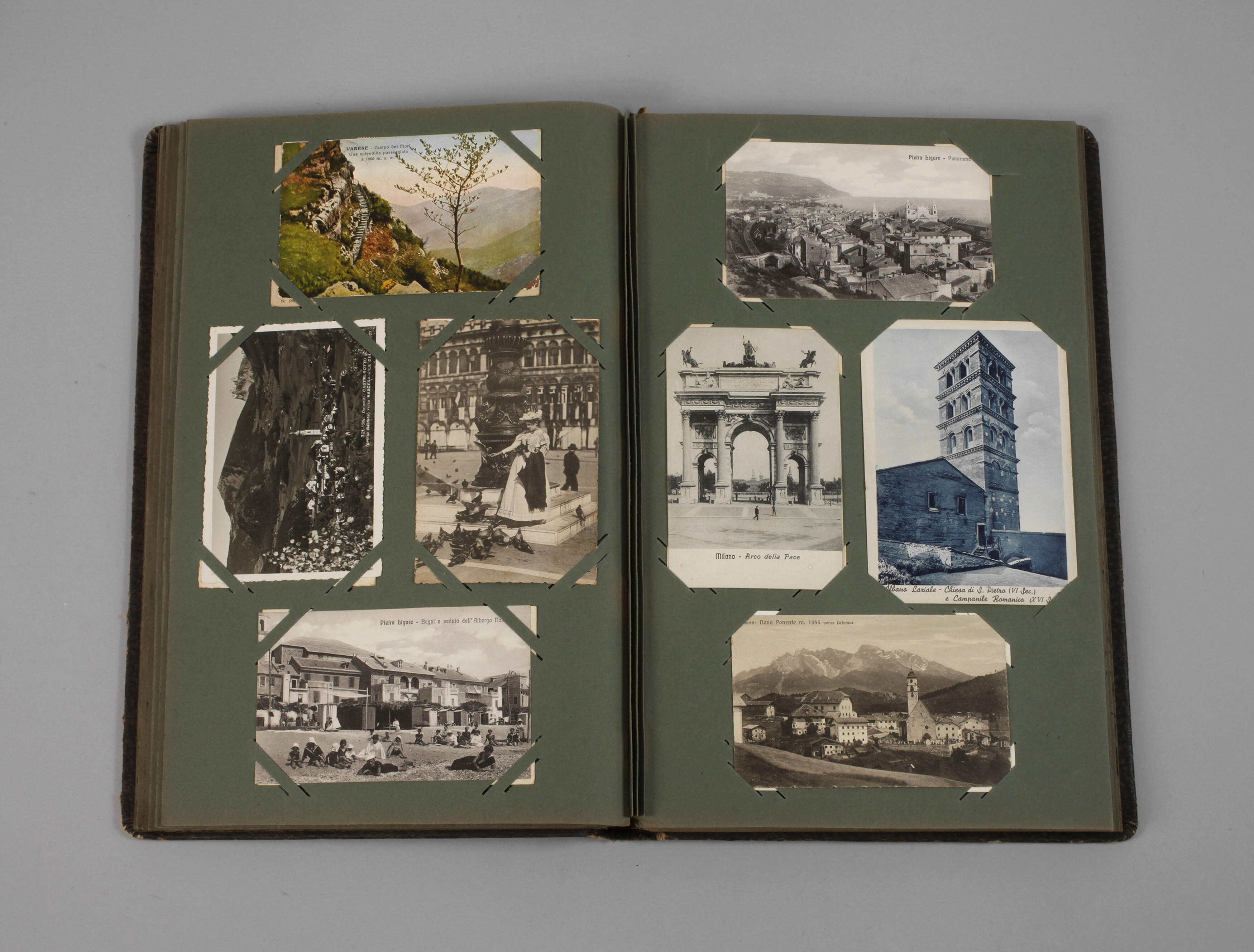 vor 1945, ca. 200 vorwiegend topographische Ansichtskarten Italien, darunter Milano, Locarno, Venezia, Genova, Dolomiten, Trieste, Torino, Verona, Pisa, Bordighera, Como, Napoli, Garda, Arosa, Roma..., wenige davon farbig lithographiert, altersgemäßer Zustand, im Album der Zeit, Maße 25 x 39 cm.