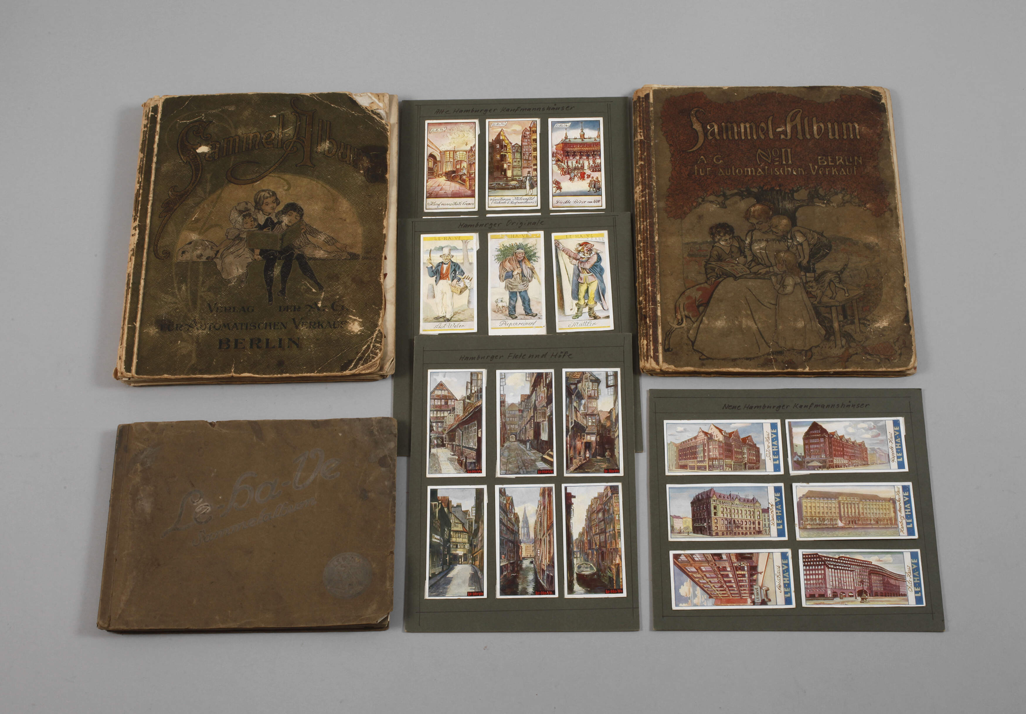 Anfang 20. Jh., Sammelalbum der A.G. für automatischen Verkauf Berlin, Nr. 1 und 2, mit Bilderserien wie Deutsche Märchen, Trachten, Kinder Bilder, Im Manöver, Waldvögel, Instrumente, Bäume, Schiffsbau, Kirchen, Mythologie, Kolonien, Marine, Armee, Käfer, Fürstinnen, Heerführer, Brücken...; Album LE-HA-VE mit Serien wie Militär, Mühlen, Kaffee, Städte, Sport, Schiffe, Kirchen, Uniformen, Hamburg…, nicht komplett, zusammen mit ca. 400 Bildern, im altersgemäßen Zustand, die Alben mit Erhaltungsmängeln, Maße 22 x 28 cm und 17 x 23 cm.