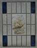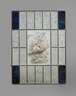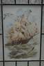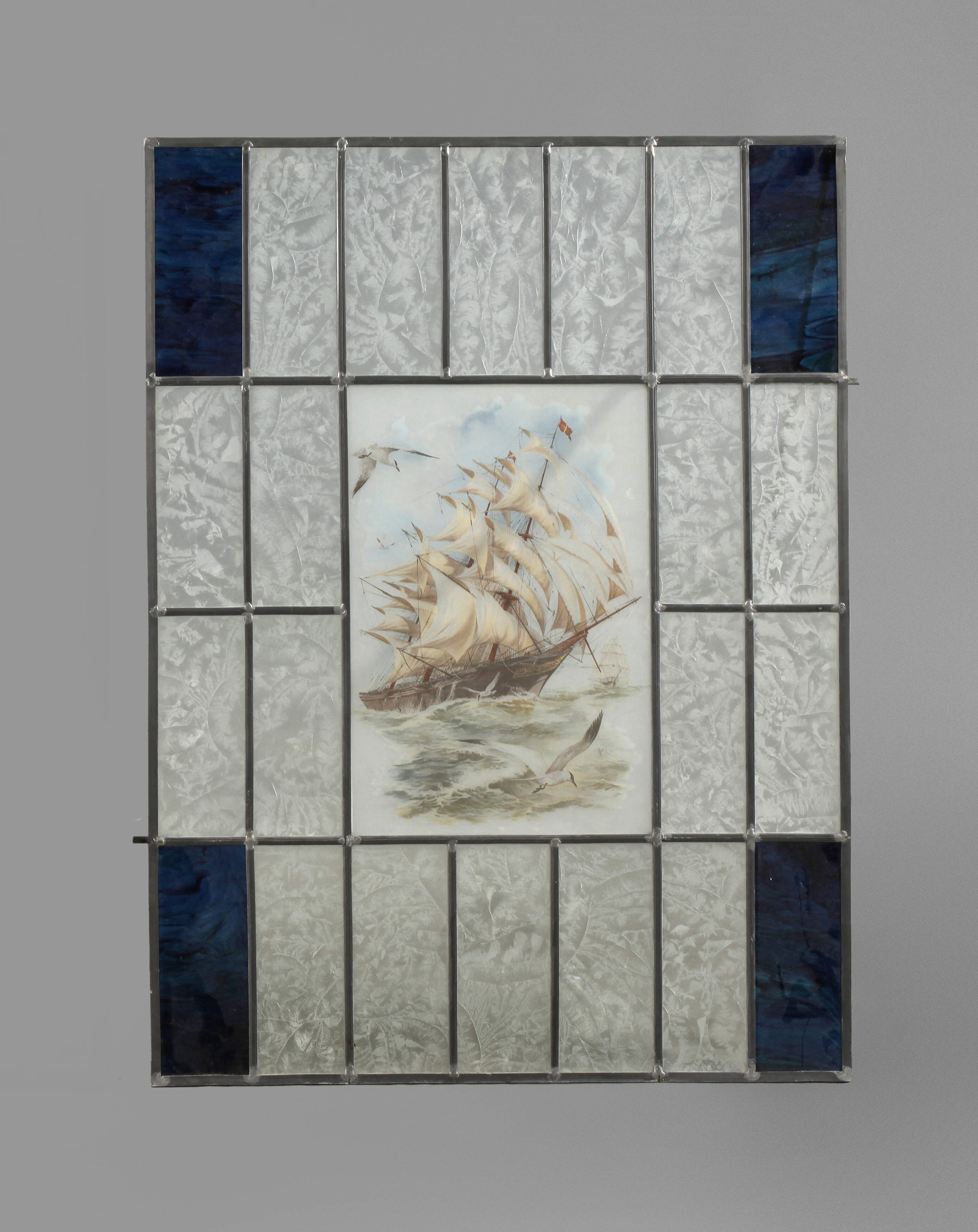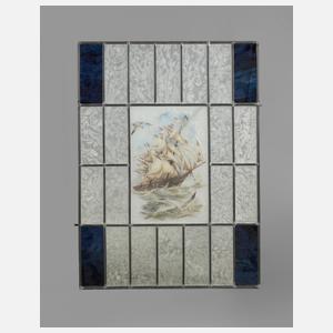 wohl 1930er Jahre, Farb- und Ornamentglas, mit Eisglasätzung, mittig handgemalter Dreimaster unter vollen Segeln, Maße 94 x 68 cm.