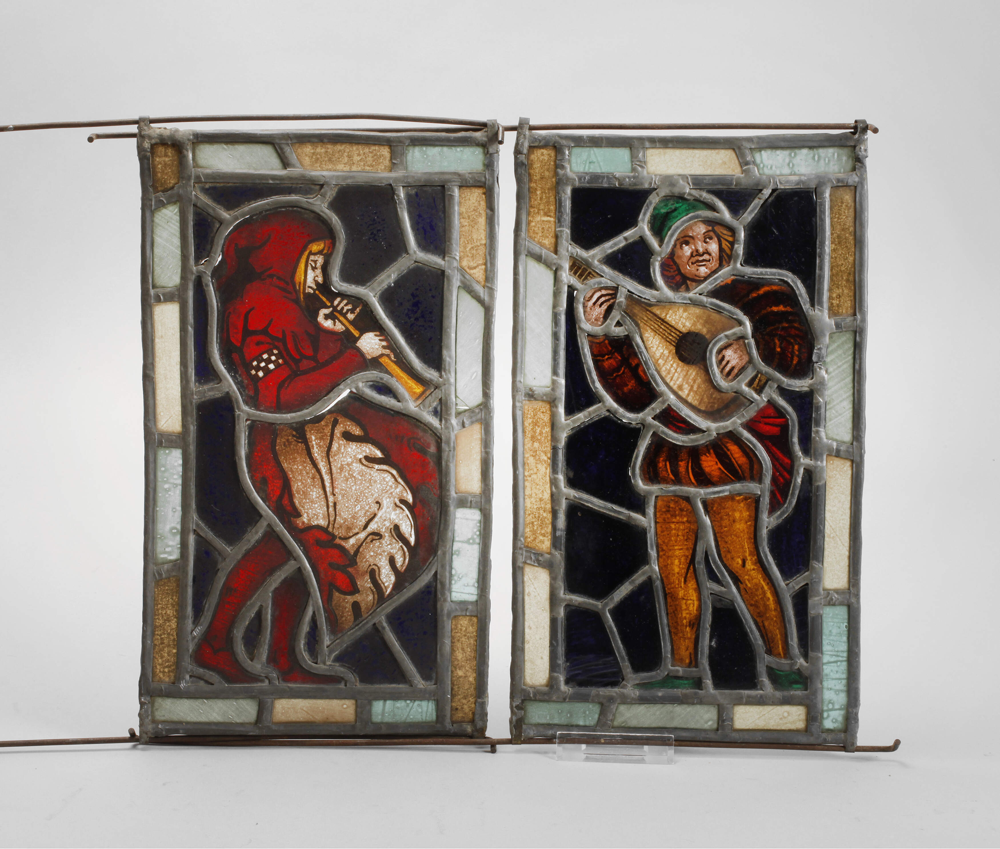 Anfang 20. Jh., Darstellung zweier Musikanten, in Farbglas, partiell bemalt, mit späterer Wandaufhängung, Altersspuren, minimale Defekte, Maße je 31 x 18 cm.