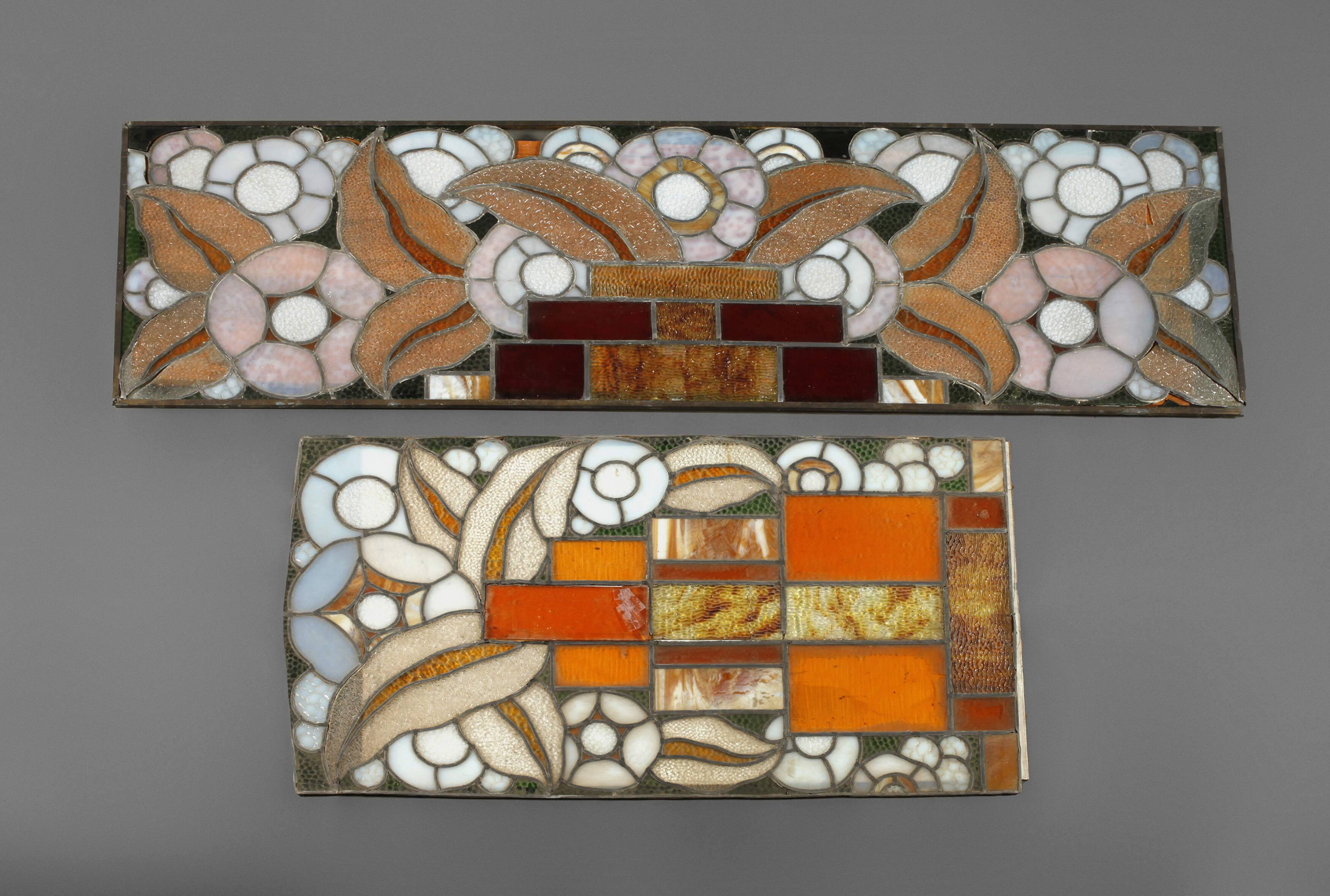 wohl Frankreich, 1920er Jahre, Scheiben mit stilisierten Floralmotiven aus Farb- und Ornamentglas, instabil, Verbindungen teilweise gelöst, vereinzelte Beschädigungen, restaurierungsbedürftig, Maße 176 x 54 cm und 111 x 64 cm.