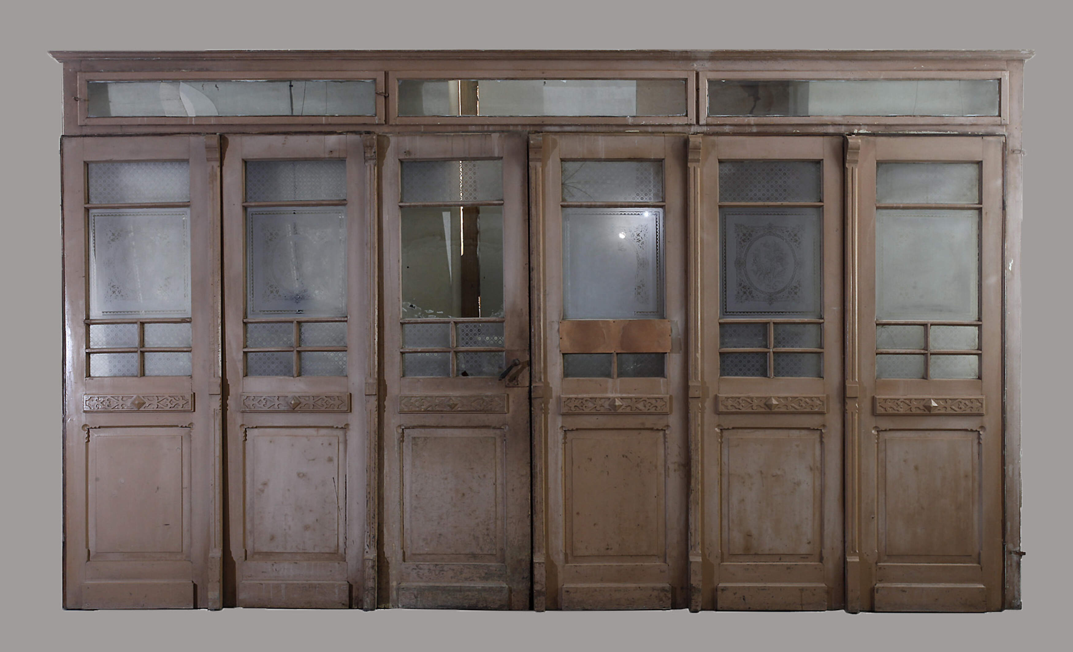 um 1870, sechsflügelige Türen und Oberlicht, aus Nadelholz, hellbraun gestrichen, mittig geschnitzte Verzierungen mit Diamantierungen, ornamental geätzte Zierscheiben, teilweise fehlend oder defekt, komplett mit Zarge und Zierleisten, rest.bed., Maße 260 x 455 x 60 cm.