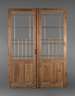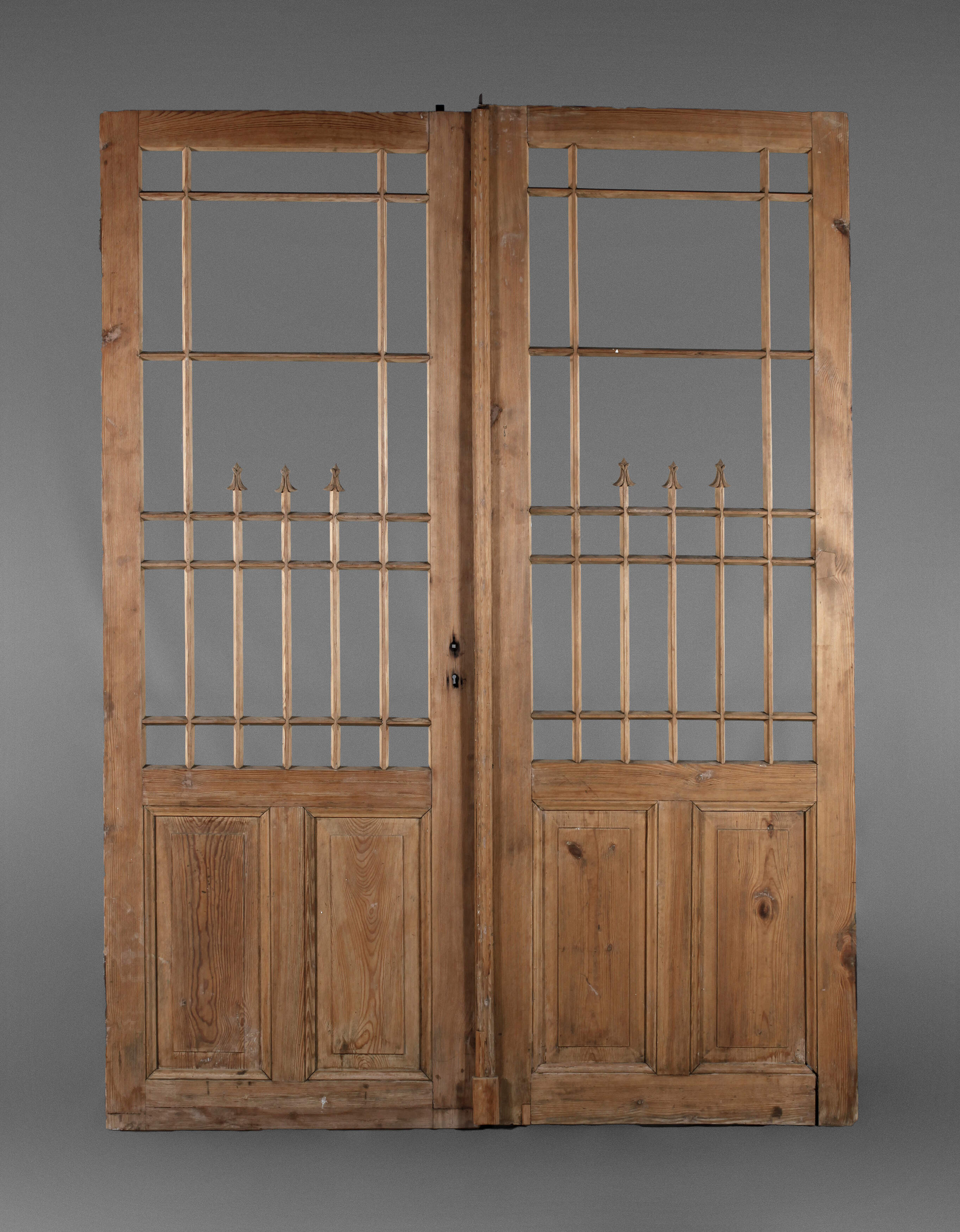 Ende 19. Jh., zweiflügelige Tür aus Nadelholz, mit aufwendiger Versprossung, entglast, abgebeizt, ohne Beschläge, Maße 238 x 175 cm.