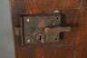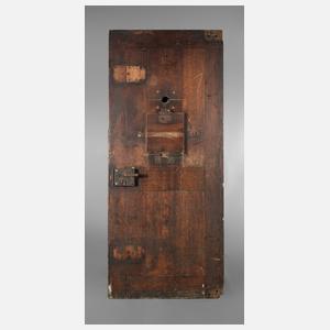 um 1900, Eiche massiv, 6 cm starke Tür, mittig mit scharnierter Klappe und Guckloch, schweres eisernes Türschloss, Beschläge fehlen, stärkere Altersspuren, restaurierungsbedürftig, Maße 205 x 88 cm.