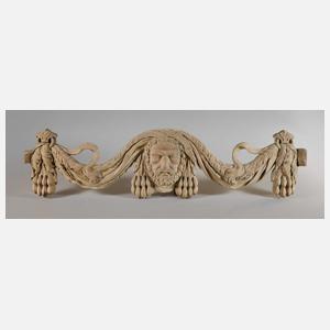 aus massivem Nussbaum? geschnitzt, 20. Jh., Darstellung von Herkules mit Löwenfell, Reste alter Farbfassung, Maße 34 x 127 x 8 cm.