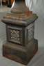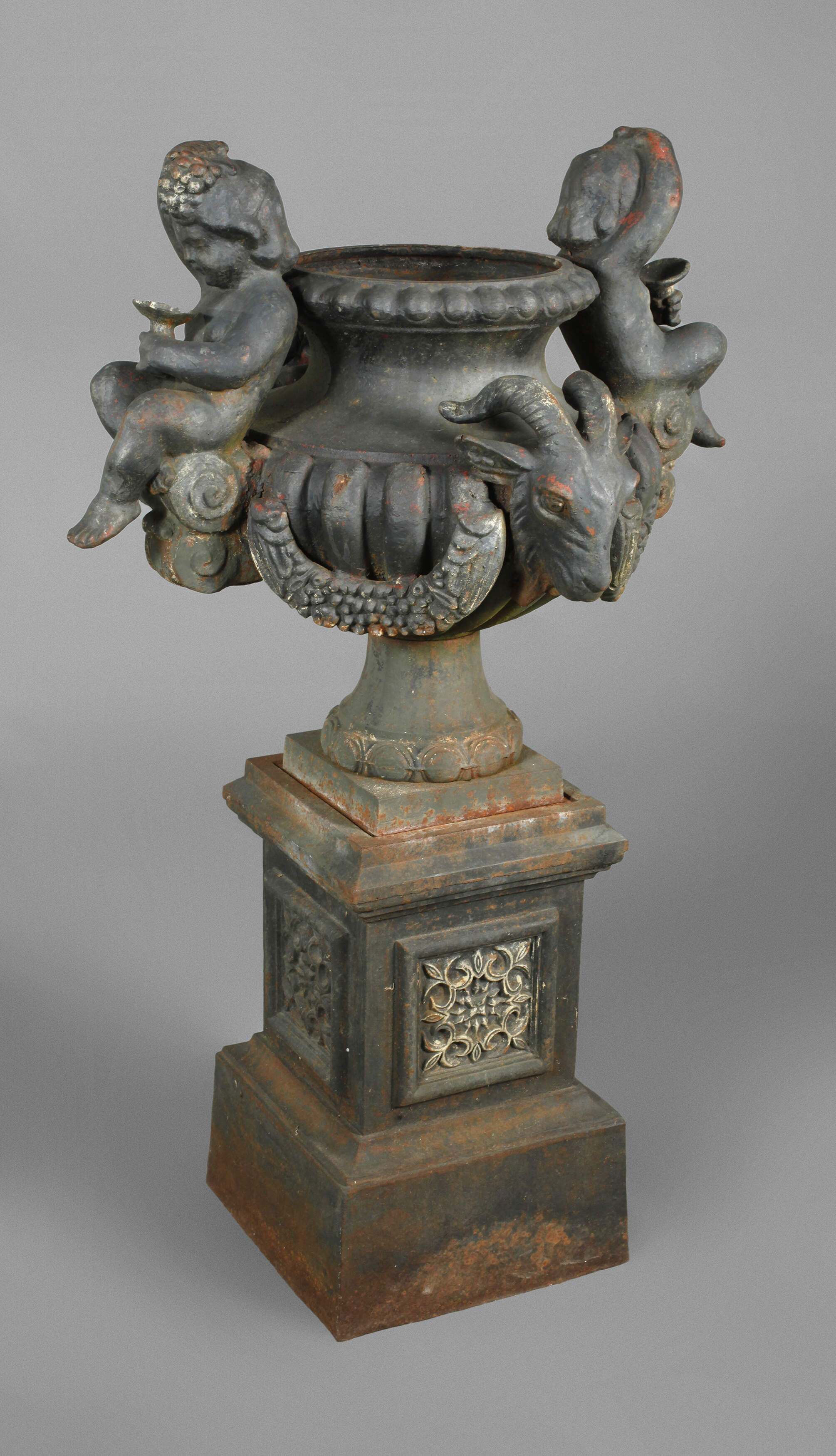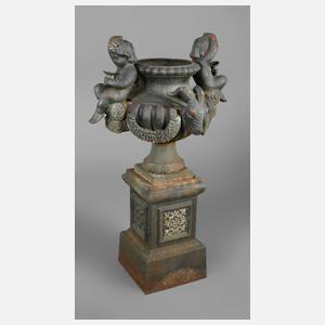20. Jh., zweiteilig gegossenen, klassizistische Amphore, verziert mit zwei Bacchanten und Widderköpfen, dazwischen Blütenfestons, auf hohem Sockel mit quadratischem Querschnitt, Oberfläche später schwarz gefasst, Alters- und Korrosionsspuren, H 123 cm.