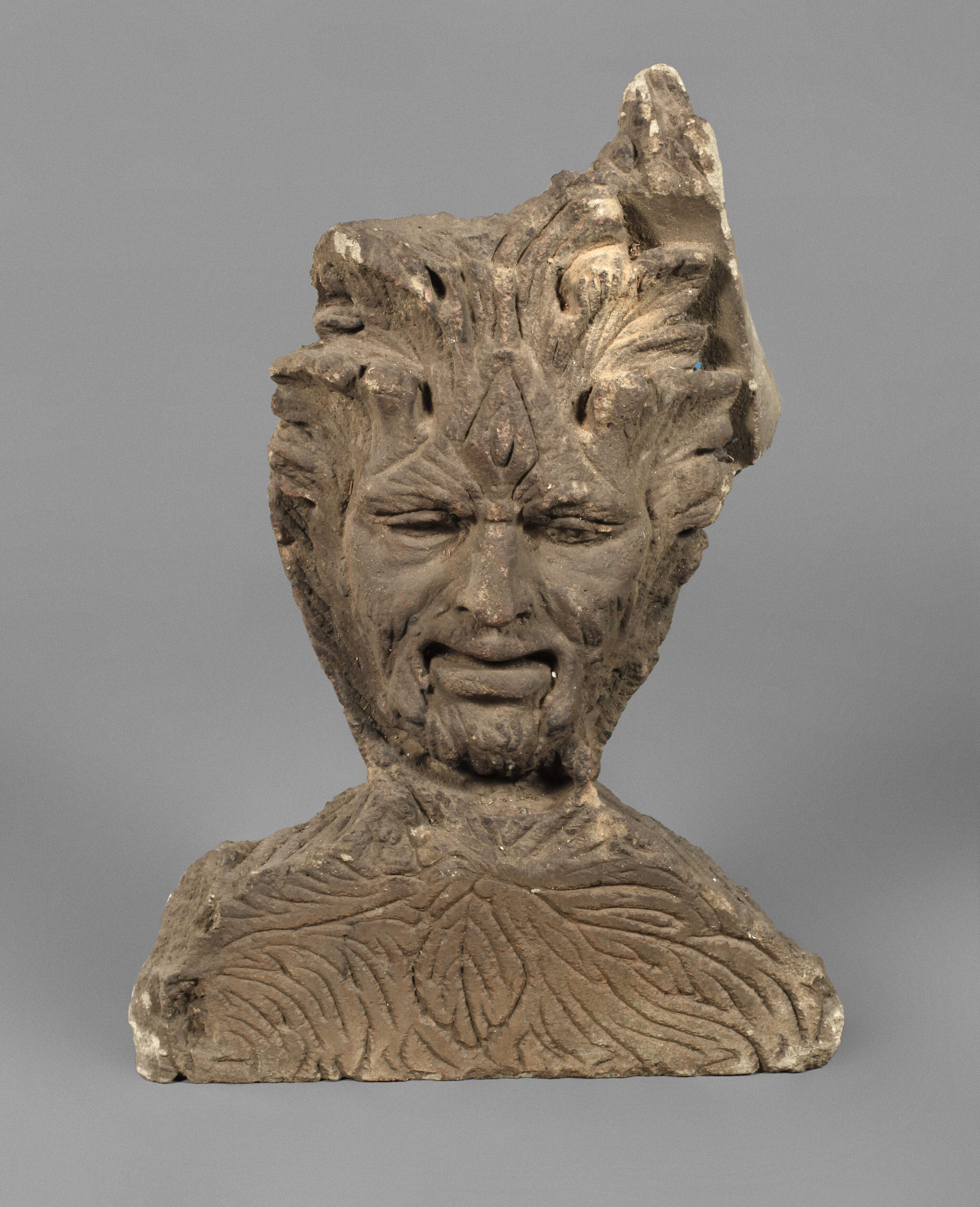 wohl Teil eines Fassadenelements, 19. Jh. oder früher, Büste eines Fauns, Oberfläche verwittert, Altersspuren, Maße 71 x 53 x 15 cm.