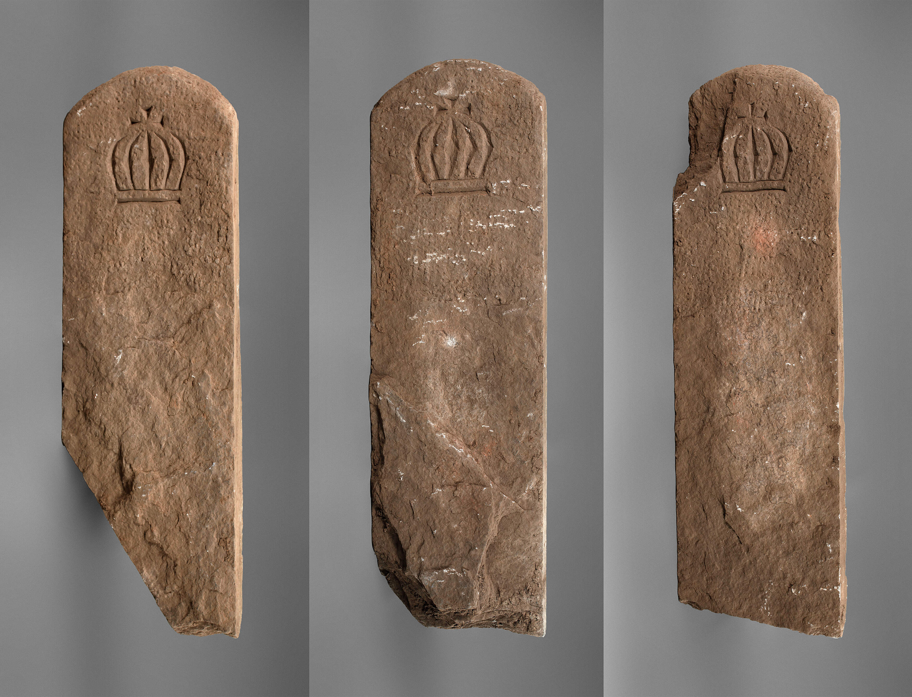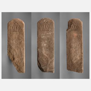 Sachsen, Anfang 19. Jh., aus Theumaer Fruchtschiefer, mit gravierter Königskrone, rückseitig mit Entfernungsangabe, ein Stein mit Fehlstelle, einer später schräg eingekürzt, L je ca. 80 cm.
