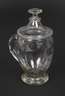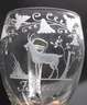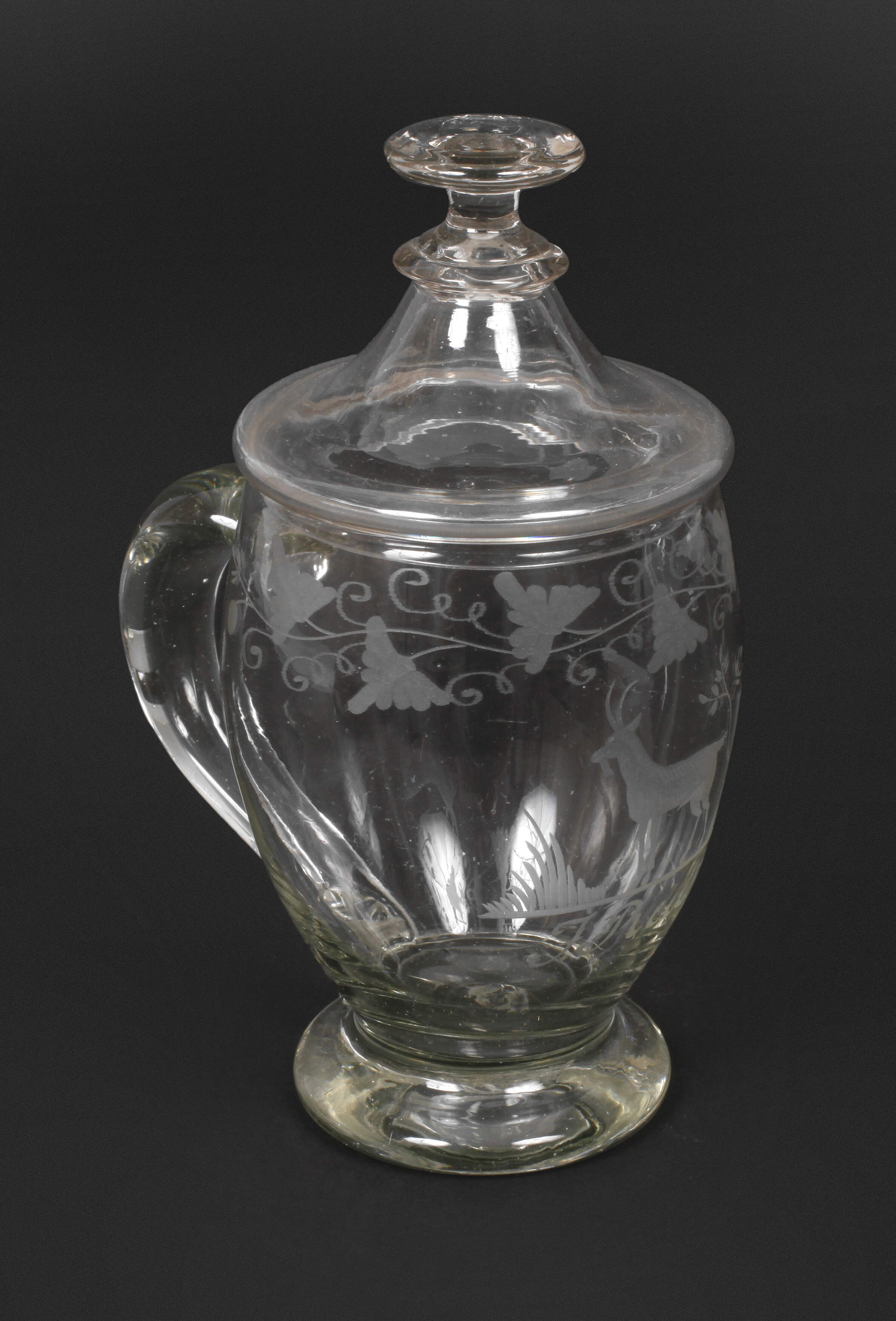 1. Hälfte 19. Jh., farbloses Glas, blasiger Abriss, bauchig mit Mattschliffdekor, Ziegenbock unter Blattranken, Besitzername: "J. Reuß", guter Zustand, H ca. 17,5 cm.