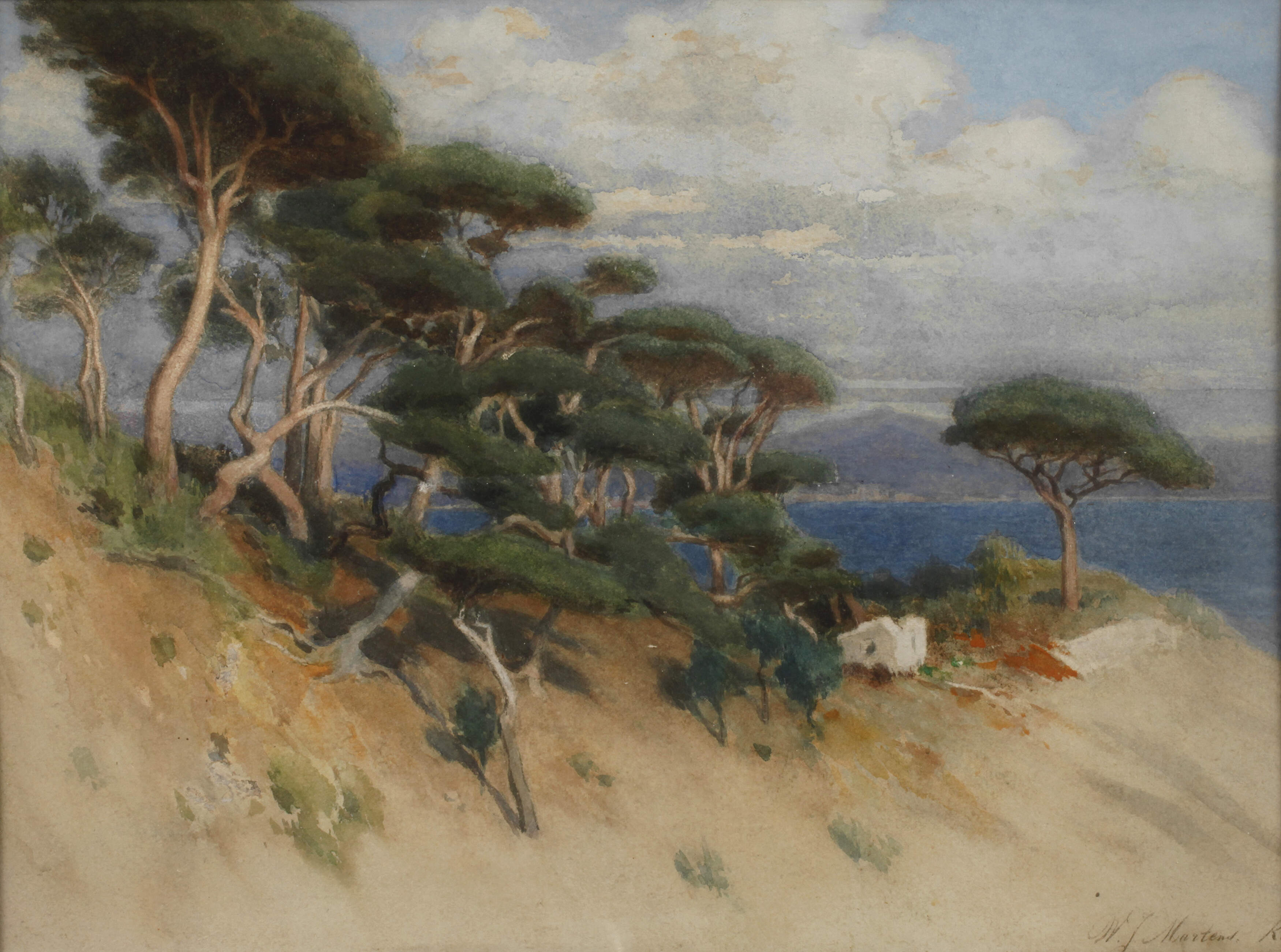 von Pinien bewachsener Vorsprung an der Meeresküste unter locker bewölktem Himmel, Aquarell, um 1880, rechts unten signiert und bezeichnet (teils durch Passepartout verdeckt) "W. J. Martens Rom (?)", unter Passepartout und hinter Glas gerahmt, Passepartoutausschnitt ca. 33,5 x 44,5 cm. Künstlerinfo: niederländischer Maler (1839 Amsterdam bis 1895 Berlin), Schüler von Nicolaas Pienemann, nach dem Studium in Amsterdam ansässig, lebte von 1871–87 teilweise in Rom, ab 1889 in Den Haag und ließ sich 1892 in Berlin nieder, Teilnahme an Ausstellungen im Münchner Glaspalast, Quelle: Wikipedia.