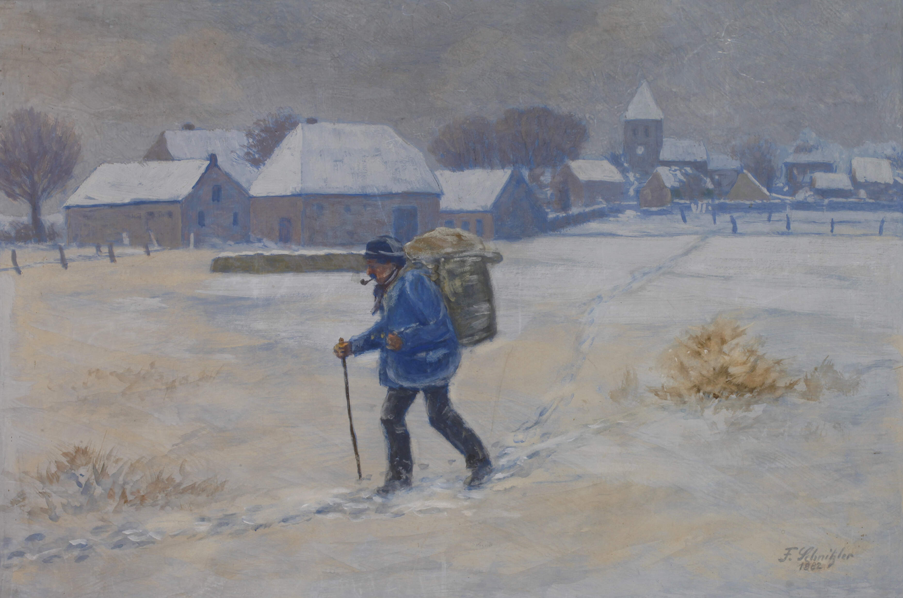durch den Schnee stapfender Bauer mit Kiepe und Stock vor der Kulisse eines Dorfes im Licht der Dämmerung, Gouache auf Karton, rechts unten signiert und datiert "F. Schnitzler 1882", minimal wasserrandig, Karton außerhalb der Darstellung mit Einrissen und Verlusten, minimal berieben, Darstellungsmaße ca. 49 x 73 cm, Kartonmaße ca. 64 x 86 cm. Künstlerinfo: auch Friedrich Schnitzler, dt. Genremaler und Illustrator (1851 Tönisheide bis 1920 ebenda), zunächst Lehre und Tätigkeit als Schmied in Tönisheide, studierte 1875–89 an der Akademie Düsseldorf bei Andreas Müller, Heinrich Lauenstein, Karl Müller, Peter Johann Theodor Janssen und Eduard von Gebhardt, 1883–85 Meisterschüler von Wilhelm Sohn, 1883–1914 zeitweilig tätig in der Künstlerkolonie Willingshausen in der Schwalm, 1893–1904 vertreten auf Ausstellungen des Münchner Glaspalastes, beschickte ferner Ausstellungen in Berlin, Dresden, Düsseldorf und Wien, Mitglied des Düsseldorfer Künstlervereins "Orient" und 1890–1920 im Künstlerverein "Malkasten" sowie ab 1899 Mitglied der Freien Vereinigung Düsseldorfer Künstler, ferner Mitglied der Allgemeinen Deutschen Künstlergenossenschaft und des Düsseldorfer Künstlerunterstützungsvereins, lebte zunächst in Düsseldorf, später in Tönisheide, Quelle: Thieme-Becker, Saur "Bio-Bibliographisches Künstlerlexikon", Boetticher, Bruckmann "Lexikon der Düsseldorfer Malerschule", Müller-Singer, Bantzer "Hessen in der deutschen Malerei", Wollmann "Die Willingshauser Malerkolonie", Schmaling "Künstlerlexikon Hessen-Kassel 1777–2000", Dressler und Wikipedia.