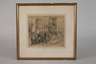 Blick ins Kircheninnere mit Militärs und Geistlichen, dem Tod des preußischen Generalfeldmarschalls Kurt Christoph von Schwerin (1684–1757) nach der Schlacht von Prag am 6. Mai 1757 (Siebenjähriger Krieg) beiwohnend, teilkolorierte Bleistiftstudie auf Papier, wohl 19. Jh., unsigniert, über der Darstellung teils undeutlich in Tusche bezeichnet "im Margarethen-Kloster 6. Mai Schlacht bei Prag, Tod von Schwerin", gegilbt und lichtrandig, hinter Glas und Passepartout gerahmt, Passepartoutausschnitt ca. 20,5 x 24 cm.